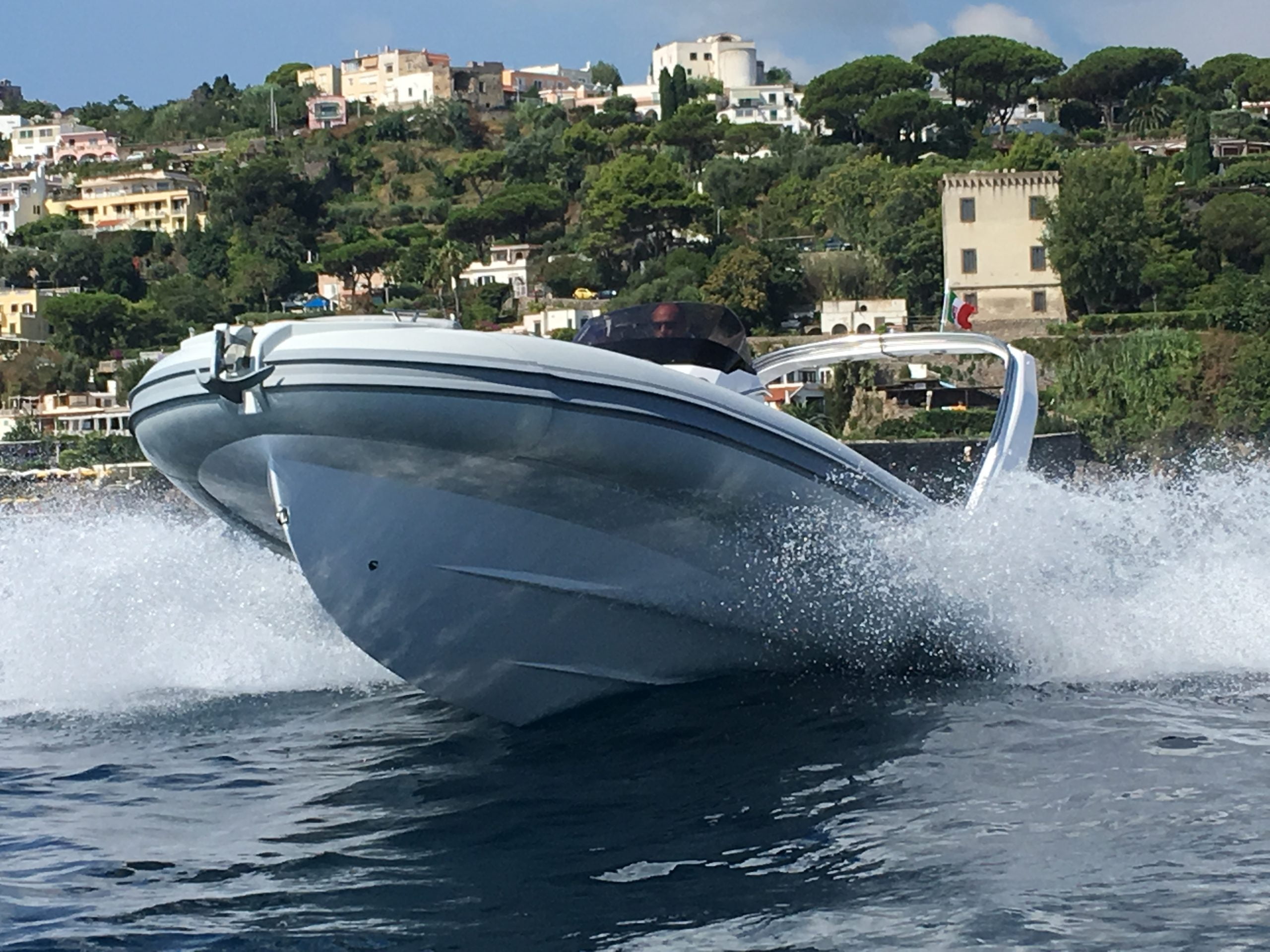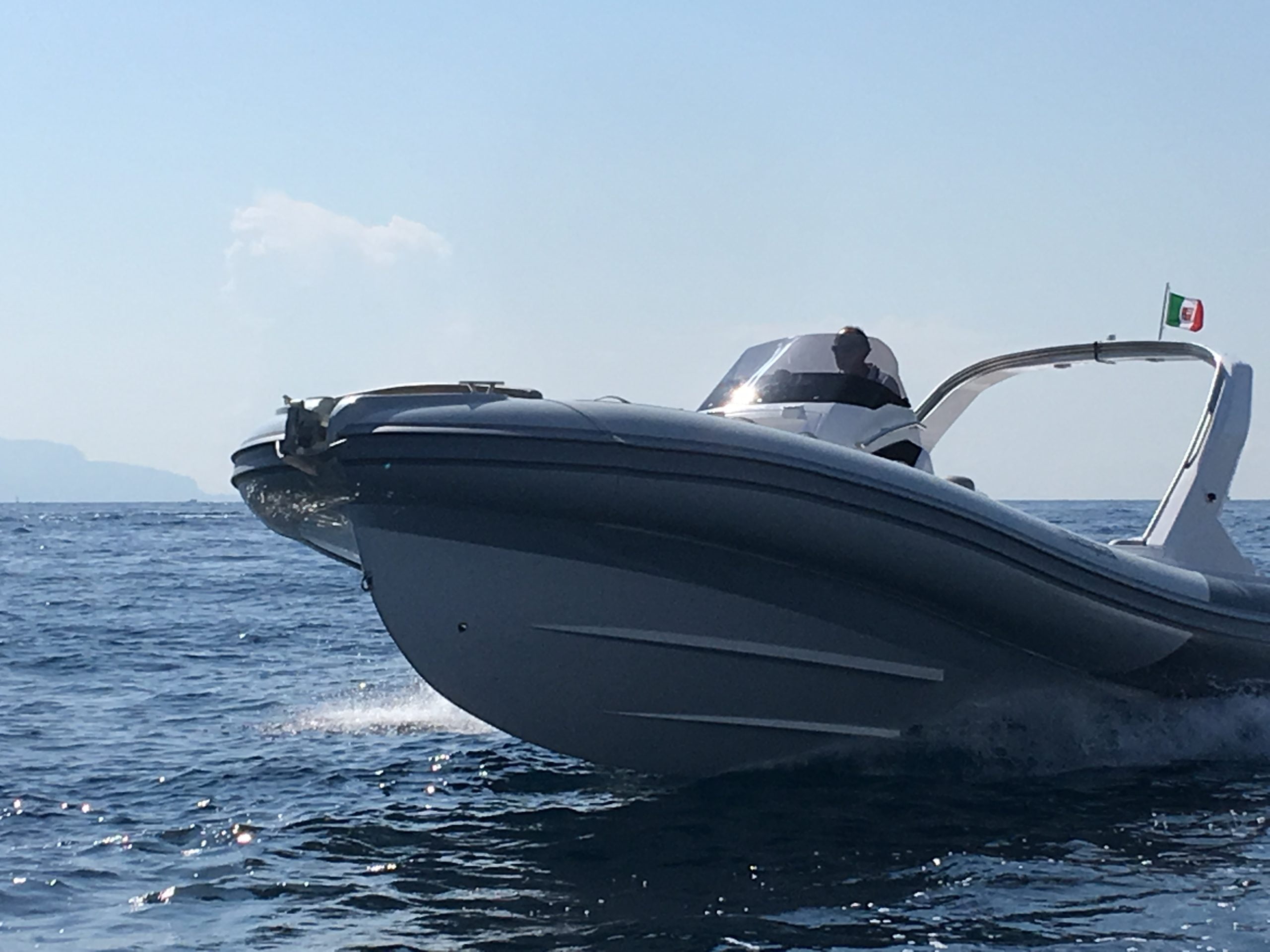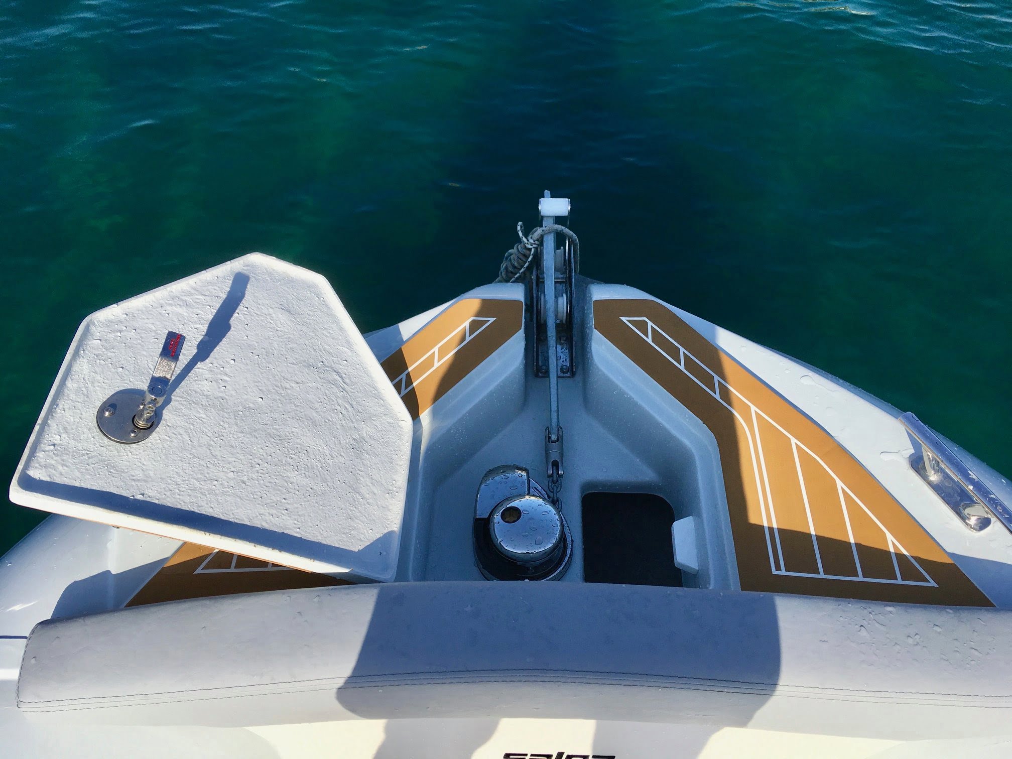 Teca sintética en plataforma de popa y morro de proa.