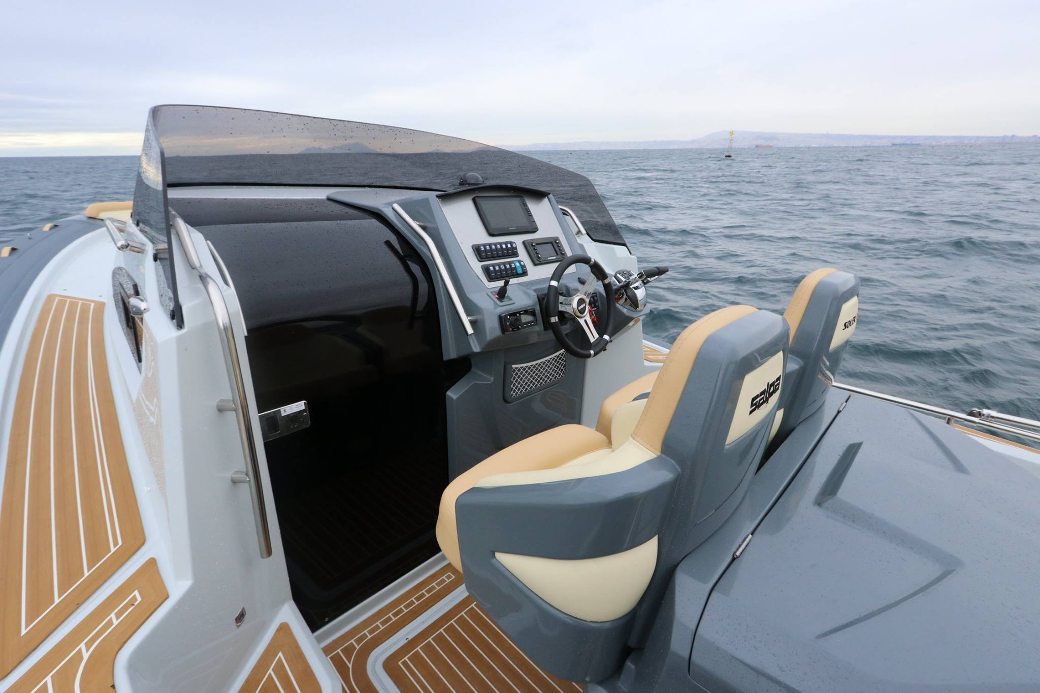 Suelo de cabina en laminado de teca con borde de arce.